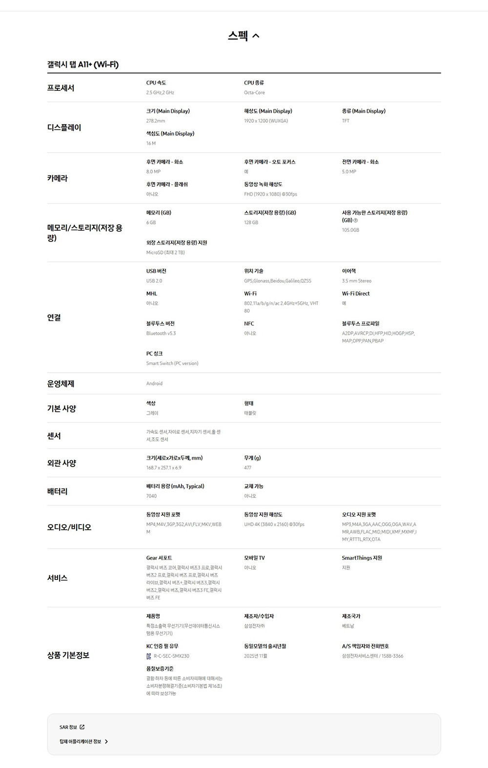 갤럭시 탭 A11+ (Wi-Fi) SM-X230NZALKOO 그레이 128GB