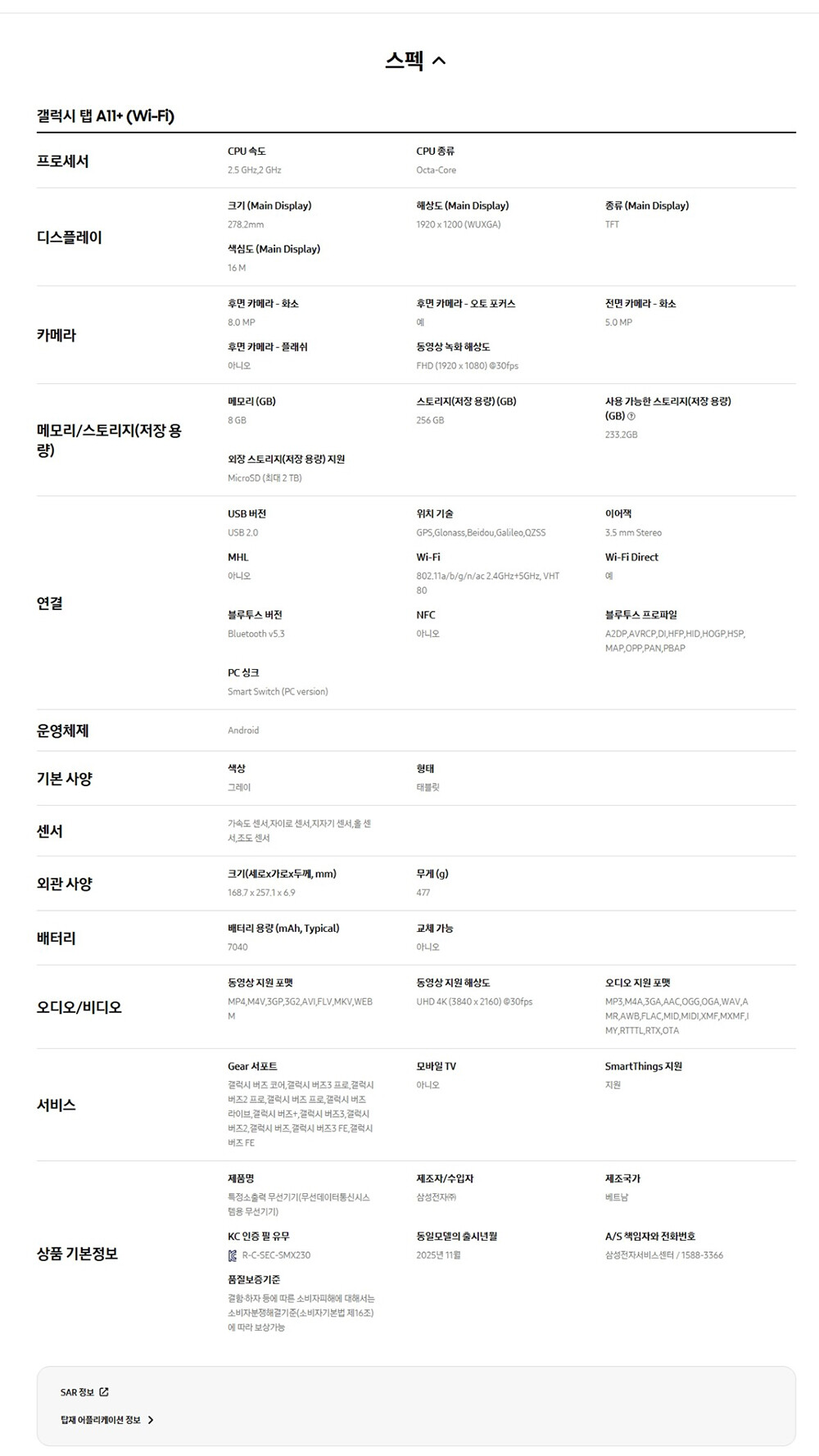 갤럭시 탭 A11+ (Wi-Fi) SM-X230NZALKOO 그레이 256GB