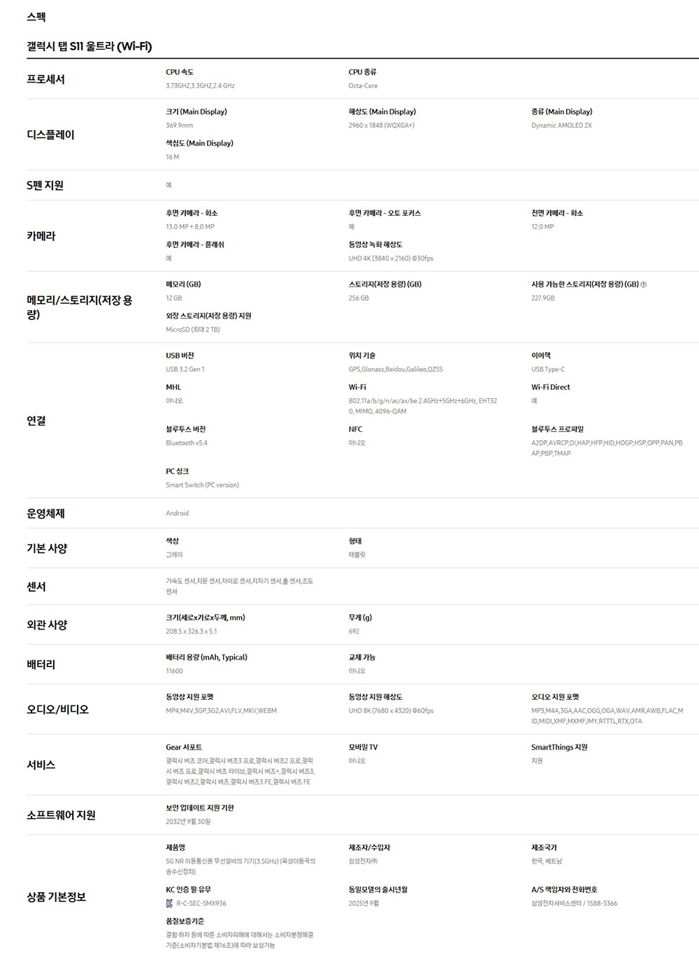 갤럭시 탭 S11 울트라 (Wi-Fi) SM-X930NZAAKOO