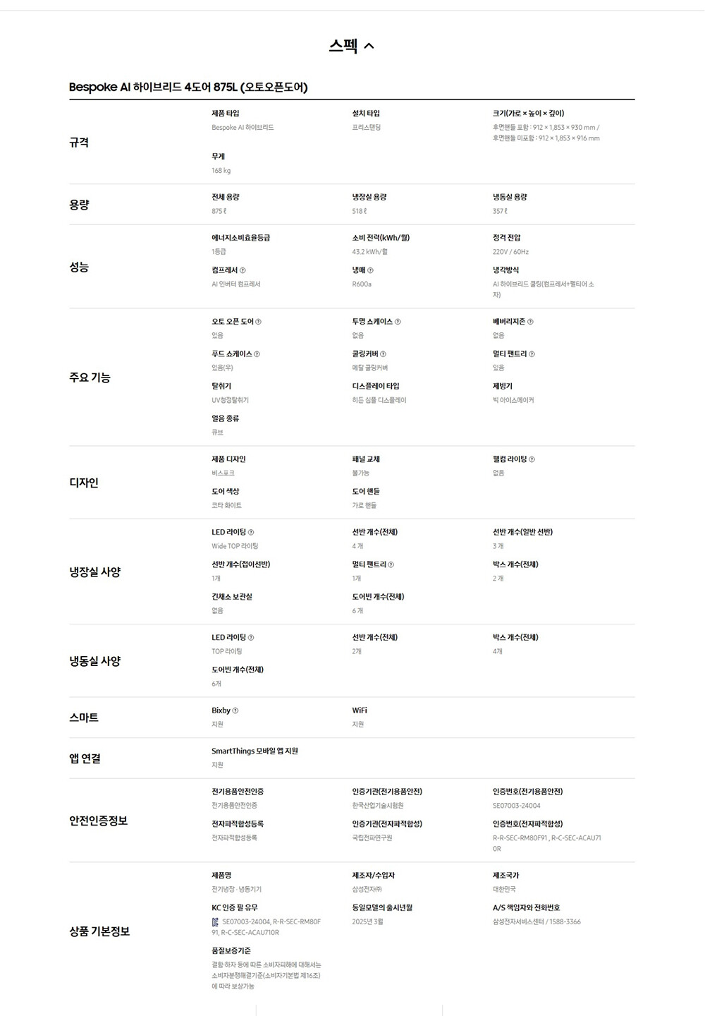삼성 Bespoke AI 하이브리드 4도어 875L (오토오픈도어) RM80F91L1A