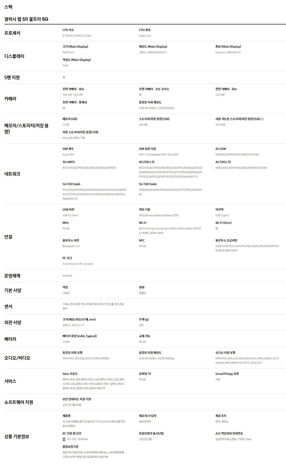 갤럭시 탭 S11 울트라 5G SM-X936NZAAKOO 256GB